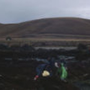 Rolling hills serve as a backdrop as students gather samples along the rocky coast at Cayucos.