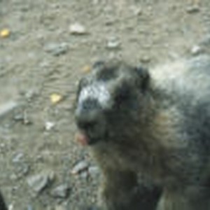 A hoary marmot sticking out its tongue while walking along Logan Pass.