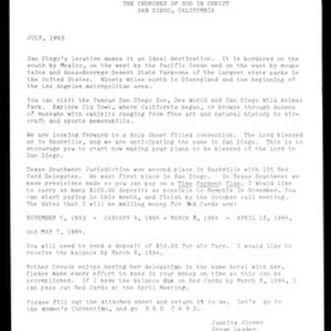 Juanita Glover (Church of God in Christ. Women's International Convention), Texas, circular letter, 1993 July. Regarding convention in San Diego in 1994. [Description English/roman)]