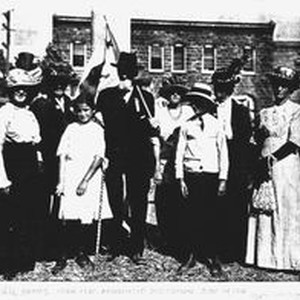 James McChristian, one of the original Bear Flaggers, with his daughter Delphine McChristian Frates and her children, Marie Louise Frates and Joseph J. Frates at the Bear Flag Monument dedication, June 14, 1914 in the town of Sonoma, California