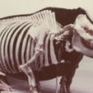 Close-up of a skeleton of a giant rhinoceros from the Pliocene epoch.