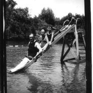 Photo--black and white:--Strout family of Sebastopol--man and 2 girls and a boy on a wooden slide at Russian River. Trees and water floats in rear.