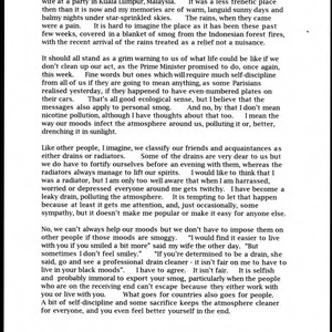 Thought for the day by Charles Handy on how one's negative disposition affects the mood of others, and how it is unfair to others to impose a negative mood onto them. Handy begins the thought discussing his time spent in Kuala Lumpur, where he met his wife, and how the recent forest fires have created a great deal of smog in the area. Handy goes on to use the smog and rain as a metaphor for what needs to take place in personal relationships, where personal smog, as a mood, can pollute one's environment. He discusses the way his wife has influenced him to recognize how his disposition affects others. Handy concludes his thought stating that self-discipline and sacrifice are important in keeping one's environment functioning effectively.