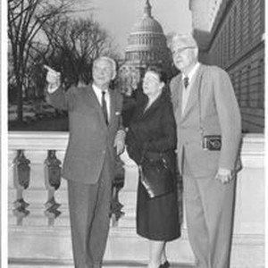 Photo--black and white: California Congressman Hubert B. Scudder on left pointing, with Mrs. Bess Hallberg and Oscar Hallberg in Washington D.C. Captiol building in background. Photo is mounted on mat board. January, 1958. Additional copy of photo in postcard format with message on verso.