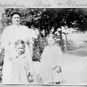 Photo--black and white: Grandmother Harriet (Sebring) Allen and granddaughters Blanche Riddell and Alice Riddell. Circa 1908.