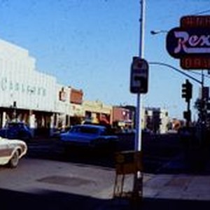 Print, color: Looking south on North Main Street Sebastopol, about 1970s and the McKinley Street intersection. Carlson's, Jack's and Analy Rexall are seen.