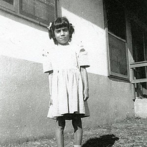 In a gingham dress and Mary Jane shoes, Maria Rosalia Mu�oz stands in front of a house at the Maravilla Projects.