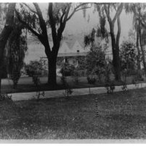 Photo--black and white: Jasper O'Farrell's Analy Ranch--O'Farrell Ranch with house in background. A croquet game is in the yard and trees line the drive to the house in the middle of the photo. The ranch was located in Analy Township near Freestone. Circa 2000, the location of the Trappe Family dairy at 12620 Bodega Highway is where the Analy Ranch was located.