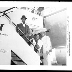 Photograph (p. 22 from an unidentified publication) of "Bishop C.H. Mason, wife, Missionary D. Webster, and Bishop T.D. Inglehart, leaving for Jamaica and Caribbean tour", after 1950? [Description English/roman)]