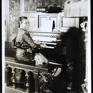 Photograph of Mother Lillian Coffey sitting at an organ, Church of God in Christ national convention, Memphis, Tennessee, [s.d.]. "Woodard's Studio" -- embossed on front. [Description English/roman)]
