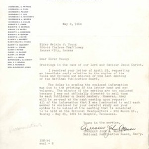 John O. Mason, letter, 1954 May 3, to Melvin Young regarding National Publication Board. [Description English/roman)]