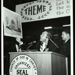 Photograph Louis Henry Ford and an unidentified man at the pulpit, Church of God in Christ meeting "theme: He th… let hi… the sp… the C…", Memphis, Tennessee, [s.d.]. From Corby Bush? [Description English/roman)]