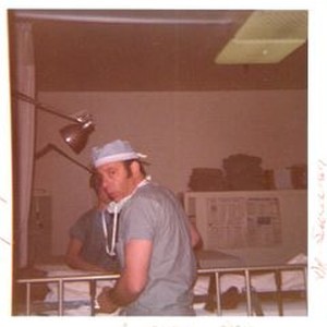 Photo -color: Dr. John Sweeney in Recovery Room of Palm Drive Hospital following patient surgery. c. 1970, Photo from Palm Drive Hospital Scrapbooks