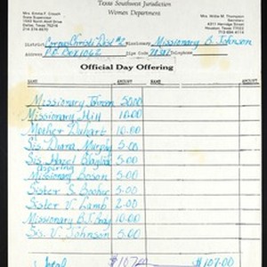 Accounting of official day offering, $107.00, Corpus Christie, Texas, [s.d.]. [Description English/roman)]