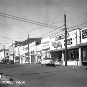 Photo - black and and white: Santa Rosa Avenue in Sebastopol looking west to Main Street, about 1940s. Business seen are Best & Feaks Real Estate and Insurance, Weeks Hardware, W. M. Wogman Realtor, Wetch Brothers, a furnature store, George L. Richard, Realtor.