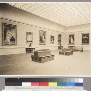The portraits on the walls, from left to right: Sir Joshua Reynolds' Diana (Sackville), Viscountess Crosbie (1777); Sir Thomas Lawrence's Sarah Goodin Barrett Moulton: "Pinkie" (1794) above a bronze sculpture, Renommée (Fame) by an unknown foundry, after Antoine Coysevox, made between 1700 and 1710; Reynolds' Jane Fleming, later Countess of Harrington (1778-1779); Reynolds' Lavinia (Bingham), Countess Spencer, and John Charles Spencer, Viscount Althorp, later Earl Spencer (1783-1784); Thomas Gainsborough's Karl Friedrich Abel (circa 1777); George Romney's Penelope (Rycroft) Lee Acton (1791); Reynolds' Sarah (Kemble) Siddons as the Tragic Muse (1783-1784); MS note on verso reads "HEH art gallery: new wing, c. 1933." Stamp on verso reads "Hiller Studio, 336 So. Hudson, TE. 6904 Pasadena."