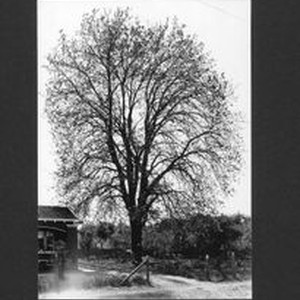 Photo--black and white: The "Miller" Black Walnut -Sebastopol, spring 1930. The tree is in early leaf stage of spring with a house on left. The Miller Ranch was between Santa Rosa and Sebastopol on Bodega Road. Typewritten information on back and dated 5/20/30 by N.F. Vanderbilt for Stark Bro's Nurseries. Burbank gave 3 seedling trees companion to the "Royal" to have tested elsewhere. This is only one of the trees he could afterwards locate. Given to & planted by Mr. Gillmin of Santa Rosa, CA in 1887.
