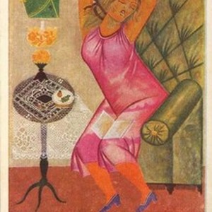A poster showing a woman sitting in a chair in a relaxed pose. No text. [Description English/roman)]