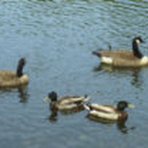 Two geese and two ducks sitting in a pond of rippling water.