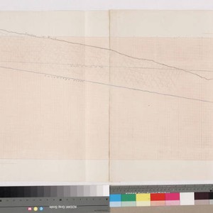 Rancho Cucamonga. Gradient of creek bed and bluff. Grade of flume or pipe, surface of bluff included. Hachures (?) and pencil annotations. Drawn on two pieces of graph paper glued together.