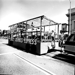 Photo--black and white: 1978 Apple Blossom Parade Sebastopol. Saucy Squares Express float being pulled by a car, at the corner of Main Street and Bodega Avenue.