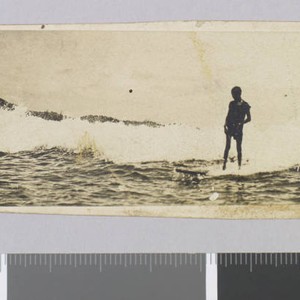 One surfer rides a surfboard near another person in the water. Title transcribed from envelope. Date transcribed from back of photo. Photo is cropped and affixed to board with print layout notes written on verso.
