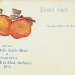 Postcard with colored drawing of two Gravenstein apples on a limb. Postcard to be used as an advertisement of Gravenstein Apple Show. Front of card blank. Message side has apples and printed message " Visit the Gravenstein Apple Show at Sebastopol August 14 to 22nd, Inclusive 1915"