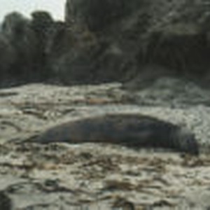 Male seal lying on the rocks and sand of North Cove on Shell Island.