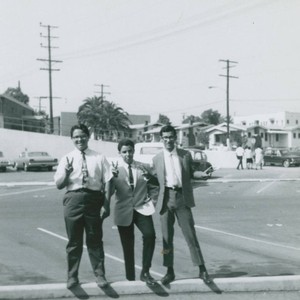Three friends flashing the two-fingered peace sign and all dressed in ties, two wearing sportcoats, in the parking lot of Stevenson Junior High School; a Chevrolet, a Ford, a VW Beetle and two other cars, as well as three other people and neighboring houses, are in the background.