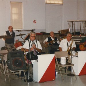 Vicente Guerrero (second from right, saxophone) in a five piece band (drums, clarinet, electric bass, guitar) at the Montebello Senior Center, late-1970s.