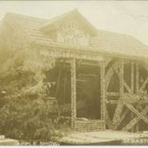 Postcard--black and white photo postcard- Gravenstein Apple Show--1910: Apple display of Sebastopol Grist Mill, 1852 sponsored by Stony Point District. The first Sebastopol Apple Show was held in a tent across from the Petaluma & Santa Rosa Depot in August, 1910 and was started to promote apple growers and their products.
