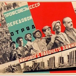 A poster dedicated to the Soviet labor unions. Caption reads, "Profsoiuzy SSSR -- peredovoi otriad mirovogo rabochego dvizheniia / Профсоюзы СССР — передовой отряд мирового рабочего движения", meaning, "Soviet labor unions are the leading unit of the worldwide workers movement". [Description English/roman)]