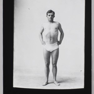 A full-length standing studio portrait of Jack London wearing only underwear. He is facing the camera, with his chest pushed out and his hands on his hips. Title devised by cataloger, date based on another print that is in JLP 456 Alb. 18 (p. 22).