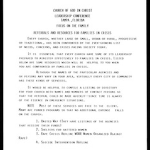 Church of God in Christ (COGIC), leadership conference syllabus, "Focus on the family", Tampa, Florida, 1992 January 22-24. Includes 22 page brochure on the broken family. [Description English/roman)]