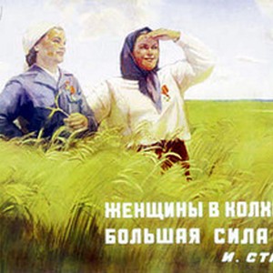 A poster dedicated to one of Joseph Stalin's statements about a role played by women in the soviet collective farms. Caption reads, "Zhenshchiny v kolkhozakh -- bol'shaia sila / Женщины в колхозах — большая сила", meaning, "Women in collective farms is a great power". [Description English/roman)]