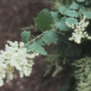 Close-up of a white blooming flower and green leaves on a tree limb.