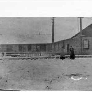 Photo--black and white: Two women with snowballs in front of the P&SR powerhouse station, Sebastopol, January, 1908. An extremely rare snowfall for Sebastopol, California.
