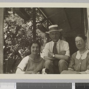 Frederick O'Brien seated on porch with Beatrice Barrangon on his right and Mrs. Barrangon on his left. Title devised by cataloger. Date from envelope. Frederick O'Brien wrote White Shadows in the South Seas, and was involved with Charmian London in the early 1920s.