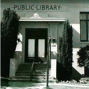 Photo--black and white: Sebastopol Carnegie library, close up front view . Located at 7140 Bodega Highway, corner of Bodega and N. High Street. Built in 1916 of the style known as the Classic Revival C by Petaluma architect Brainerd Jones. Carnegie libraries were built with money donated by Scottish-American businessman and philanthropist Andrew Carnegie. More than 2,500 Carnegie libraries were built, including those belonging to public and university library systems. Of the 2509 libraries funded between 1883 and 1929, 1689 were built in the United States. In the early 20th century, a Carnegie library was the most imposing structure in hundreds of small American communities. Most of the library buildings were unique, displaying a number of architectural styles. Each style was chosen by the community. California is second only to Indiana in the number of Carnegie libraries built with 142 to Indiana's 165. The Carnegie library was demolished in December 1975 to make way for the larger new Sebastopol Library.