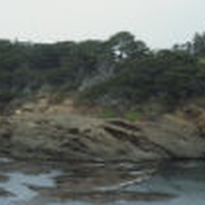 A thick grove of cypress trees lines the top of the rocky cliffs on the shoreline at Point Lobos.