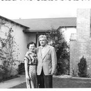Photo--black and white: Bunni and George Streckfus in front of a house in Pacific Palisades April, 1950.