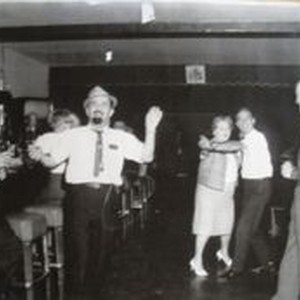 Photo--black and white: Interior of the Blue Room, bar and restaurant circa early 1950s. Neubert (Pat) Geisler is seen behind the bar, as Ernie Julius (owner of the Pine Cone Restaurant) lifts his glass in a toast. During the 1940s the Blue Room Restaurant opened upstairs with a bowling alley below. The businesses burned and the Blue Room bar and restaurant reopened in earlythe 1950s.