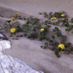 Yellow flowers creep across the sand and driftwood at Coast Guard Beach.