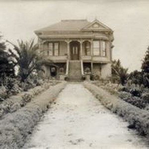 Photo--black and white: The home of Mary (Chandler), Charles Olcott and Melvin DaVall family in Sebastopol, California. Located in the area west of the intersection of the intersection of 116 and Guerneville Road. The 38-acre apple and berry ranch backed up to the Green Valley Creek. The house was a huge 3-story home. The lower story was two-thirds underground and had 10-foot ceilings, solid cement walls and floors. This underground portion was the storage area of thousands of boxes of apples. The wide cement steps led to the front door of the living quarters which was actually the 2nd floor.
