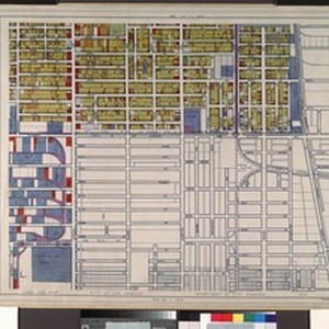 WPA Land use survey map for the City of Los Angeles, book 8 (Downtown Los Angeles and Hyde Park to Watts District), sheet 16. Includes: [Title page and] legend [for Book] no. VIII Composite index to Land use map books [for Book 8] Index to Book no. 8. Land use survey - City of Los Angeles. Department of City Planning. These maps were prepared with the assistance of the Works Progress Administration project no. 665-07-G-226 through 1939 to 1940. The land use data contained herein was compiled from a survey made with the assistance of the Civil Works Administration project no. 642, State Emergency Relief Administration project nos. 1-F2-318 and 1-F2-318A and Works Progress Administration project nos. 65-3-4377, 1101-2011 and 465-03-3-106. This survey functioned from Dec. 18, 1933 to May 8, 1939 and covers approximately 460 square miles within the boundary of the City of Los Angeles. It includes 347 colored drawings bound in 10 volumes of which this is no. VIII. The land use survey was supervised by the Zoning Engineer. The land use maps were supervised by the Illustrative Planning Engineer for the Sponsoring Department.