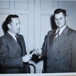 Photo--black and white: Sebastopol Lions Club scrapbook photo: Joe Johnson handing gavel to Rueben Busse, about 1952. Sebastopol Times photo.