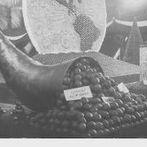 Postcard--black and white: Gravenstein Apple Show exhibit of a corniest of apples by W. J. McGowen. In the background are other exhibits made of apples. about 1915