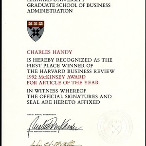 Charles Handy's "Balancing Corporate Power: A New Federalist Paper" was recognized as the first place winner of The Harvard Business Review's 1992 McKinsey Award for article of the year. The document is signed by the editor of the Harvard Business Review, as well as the Dean of the Faculty. The document contains the university's Veritas shield.