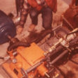 Person kneeling next to metal machinery and hoses.