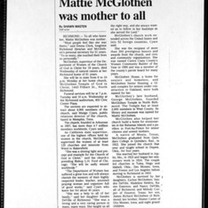 Obituary, Mattie Mae Carter McGlothen, after 1994 May 4. Shawn Masten. "Church supervisor Mattie McGlothen was mother to all" in Contra Costa Times, 1994. [Description English/roman)]